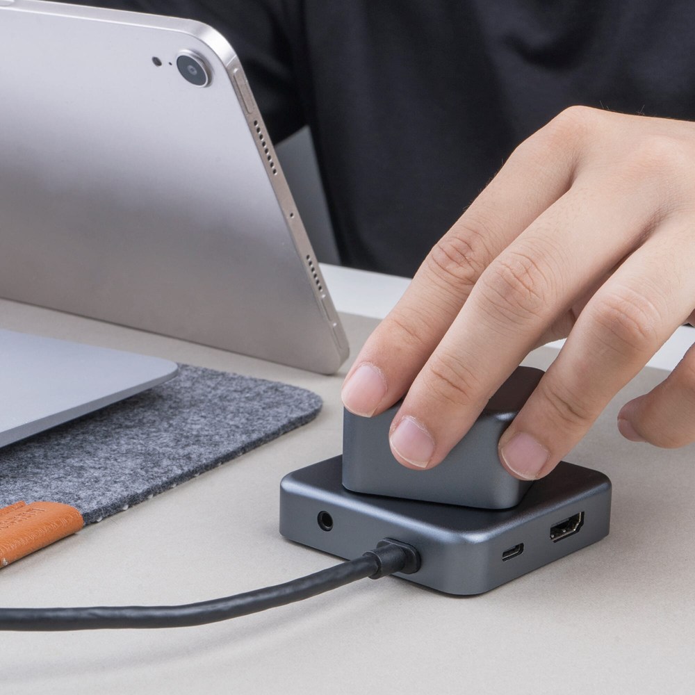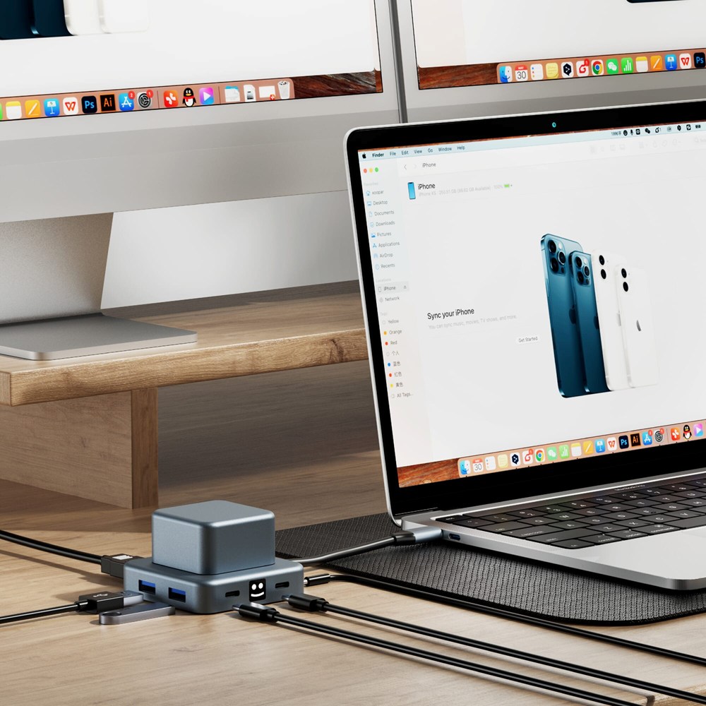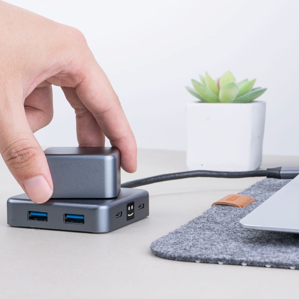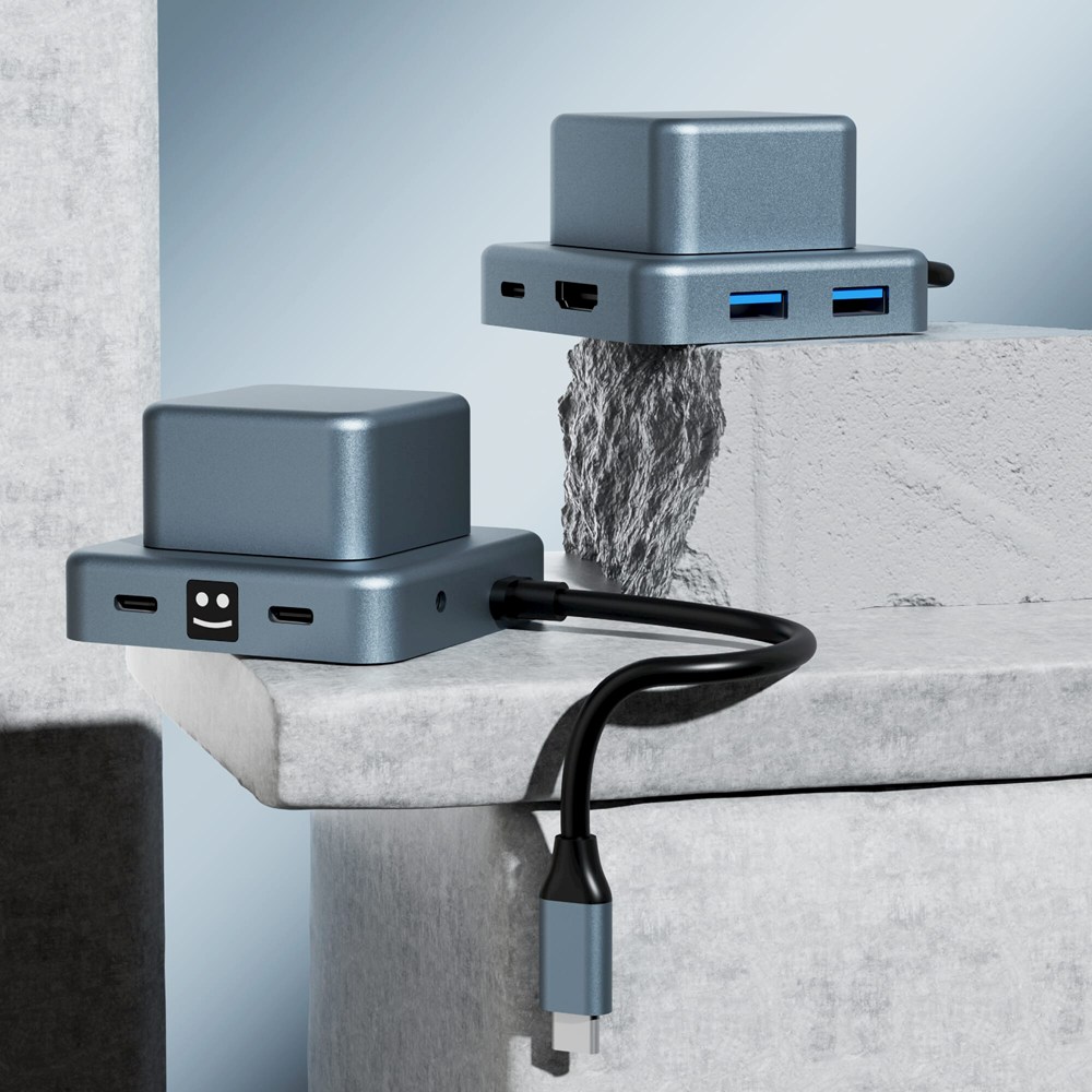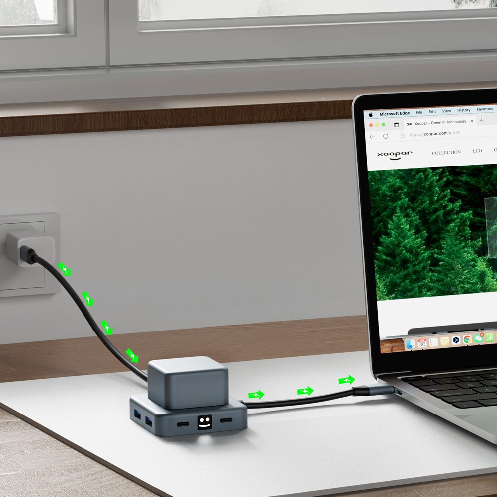 Hier gibt es keine Kompromisse! Unser Hub ist aus recyceltem Aluminium gefertigt, bietet eine stressfreie Rotation, unterstützt das Laden von Laptops mit bis zu 100 W PD und verfügt über mehrere Anschlüsse - 2 USB-A, 2 USB-C, HDMI und einen Audioanschluss. Erhöhen Sie Ihre Konnektivität auf nachhaltige Weise!