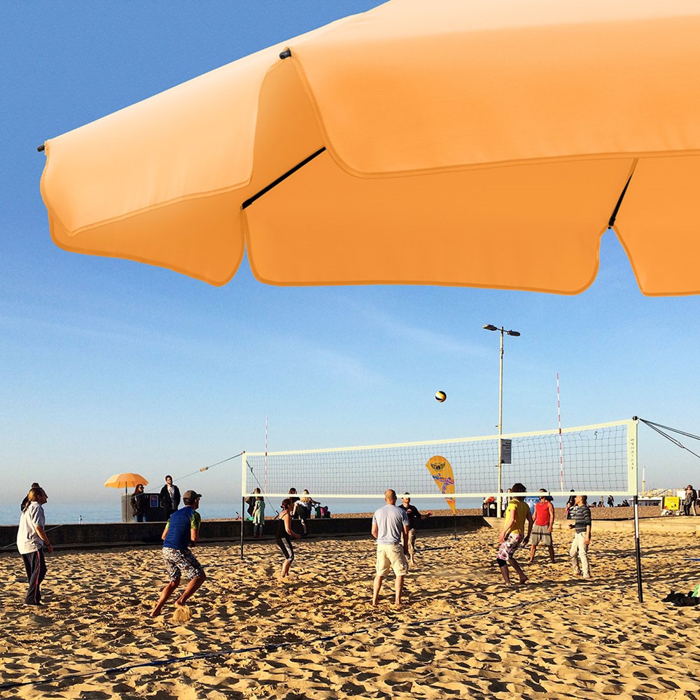 Moderner Sonnenschirm mit Gestell in Titan-Finish, Knickvorrichtung und mit Volant Einfache Handhabung durch Sicherheitsschieber, sehr stabile Fiberglasschienen, zweiteiliger und stufenlos höhenverstellbarer Stock mit Knickvorrichtung zur Neigung des Schirms, Stock in edlem Titan-Finish, Unterstock mit ca. 120 cm Länge und Drehfeststeller zur sicheren Fixierung, komfortables Tragefutteral, Bezug mit Lichtschutzfaktor UPF 50+, angeschnittenes Volant, exklusive Füllständer (Art. 8920 oder Art. 8905) / Erdspieß (Art. 8939)