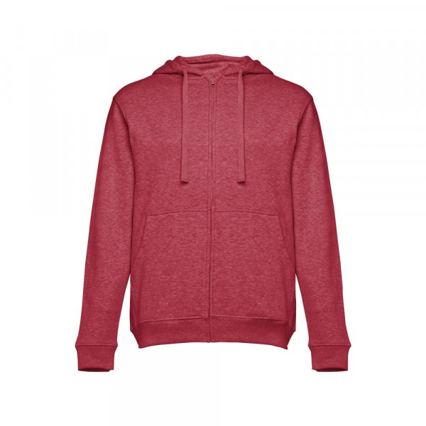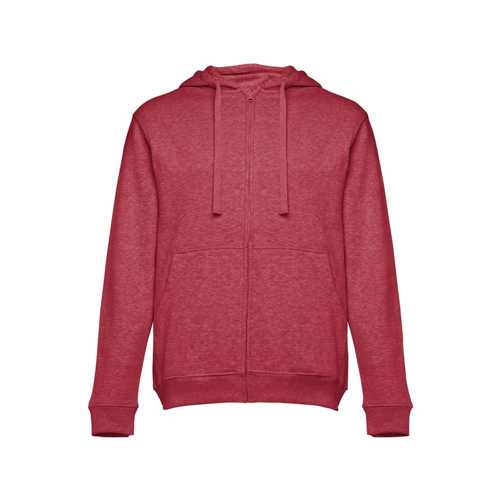 Herren Sweatjacke aus 50% Baumwolle und 50% Polyester (320g/m²) mit Reißverschluss und gefütterter Kapuze mit Kordelzug. Kardiert mit 2 Kängurutaschen, einem verdeckten Kunststoffreißverschluss und einem gerripten Bund. Größen: S, M, L, XL, XXL