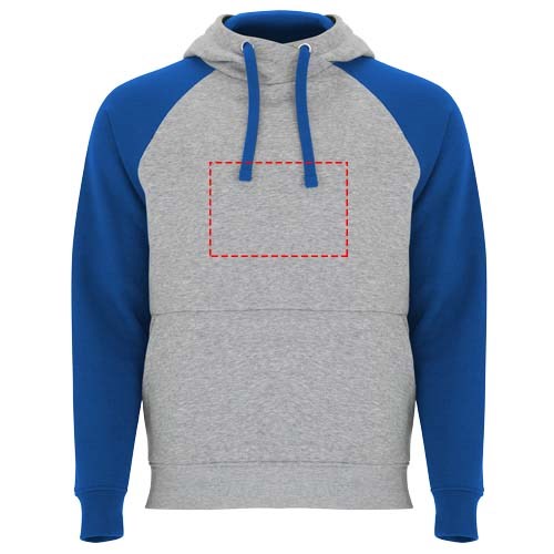 Zweifarbiger Unisex Kapuzenpulli. Kapuze mit gekreuztem Kragen und Metallösen. Innenkapuze, Kordelzug und Raglanärmel in Kontrastfarbe. Kängurutasche. Bündchen und Saum aus elastischem 1×1-Rippstrick. Abnehmbares Etikett.