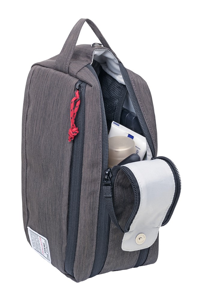 Kulturbeutel, Hauptfach mit weiter Öffnung zur einfachen Entnahme, zwei Reißverschlüsse und zusätzlicher Magnet zum Verschließen, zwei Meshfächer und drei Elastikbänder im Hauptfach, zusätzliche Fronttasche, mit Handschlaufe, wasserabweisend, leicht zu reinigen, 100% Polyester, Polyester, anthrazit/schwarz