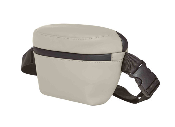 moderne Bauchtasche; Hauptfach mit 2-Wege-Reißverschluss und flachem Einsteckfach innen; wasserabweisende Reißverschlüsse; Reißverschluss-Vortasche; längenverstellbarer Gurt mit Gummilasche zur Gurtfixierung; als Hüft- oder Body-Bag tragbar; große Schnalle seitlich für komfortables Öffnen und Schließen