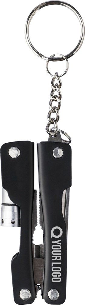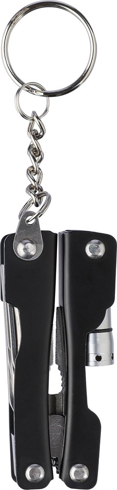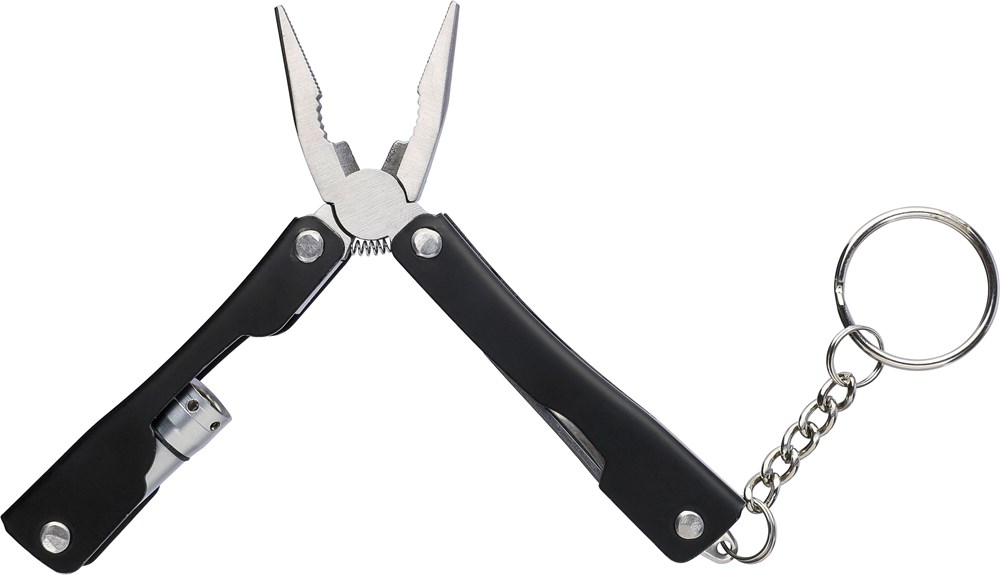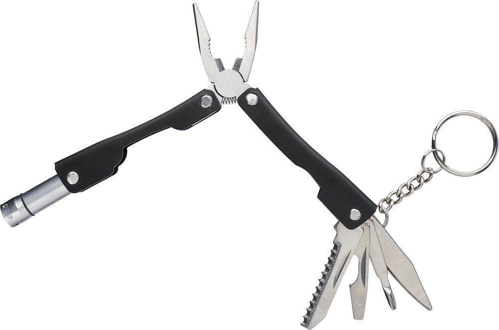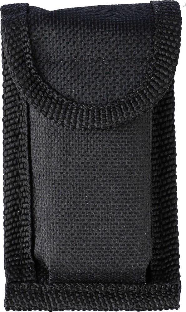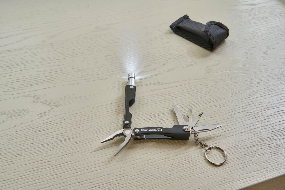Faltbares Multitool aus rostfreiem Stahl mit 10 Funktionen. Mit einer 1-LED-Taschenlampe. Verpackt in einer 600D-Polyestertasche mit Klettverschluss. Die Tasche kann am Gürtel befestigt werden. Einschließlich Batterien. Einzeln verpackt in einer braunen Pappschachtel.