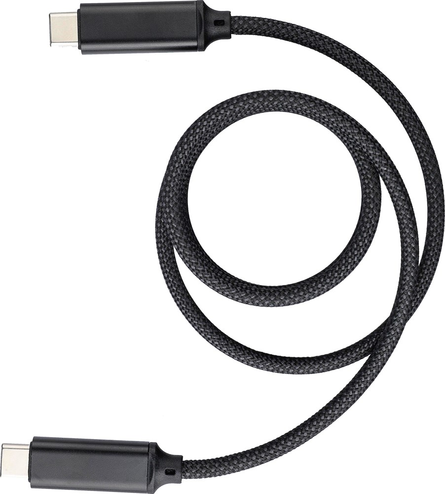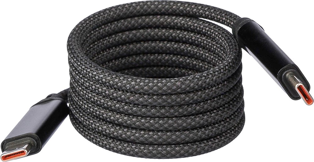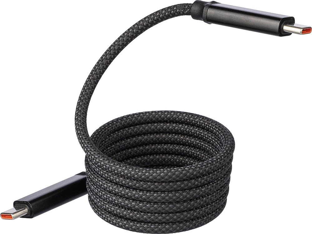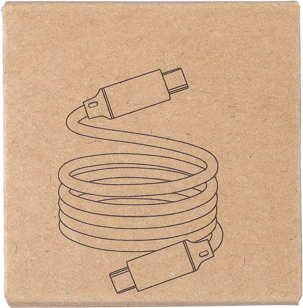 Nylon Typ-C auf Typ-C Daten- und Ladekabel mit einer Länge von 1 Meter. Datengeschwindigkeit von 240 Mbps. Der eingebaute Magnet ermöglicht es, das Kabel automatisch und strukturiert aufzurollen. 240 Mbps Datengeschwindigkeit / 60W Ladeleistung. Einzeln verpackt in einer braunen Geschenkbox aus Karton.