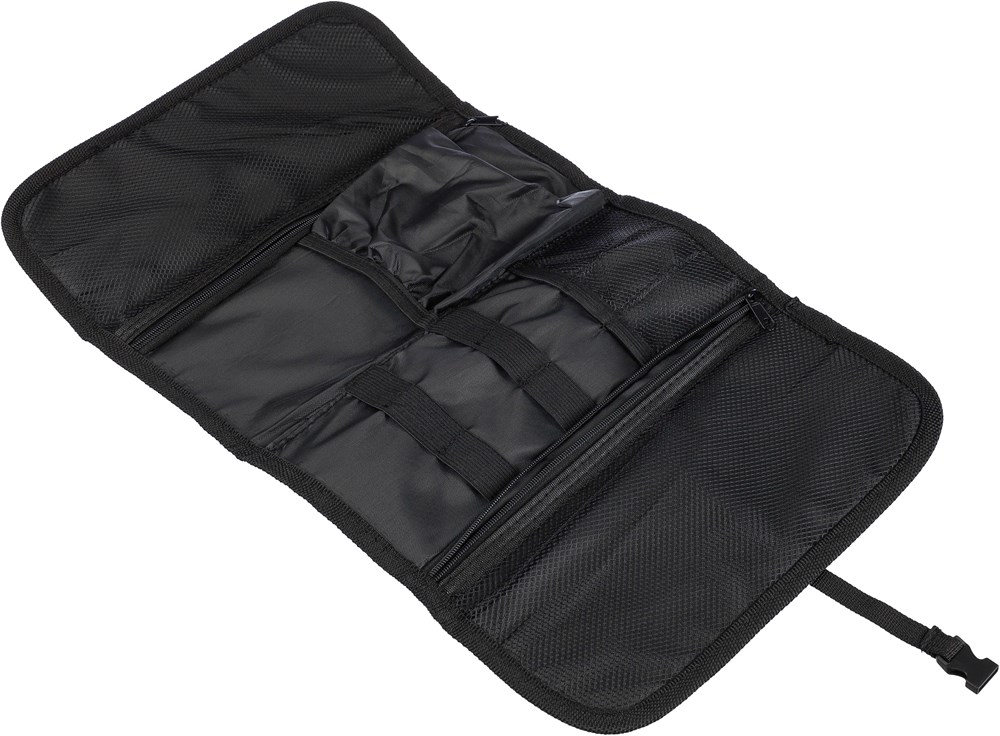 Rolltasche aus 1680D Polyester mit Kunststoffschnalle. Mit mehreren Innentaschen und Reißverschlussfächern zur Aufbewahrung von Ladekabeln oder Geräten.