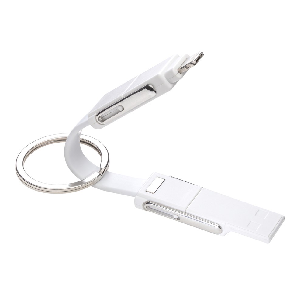 Das 6-in-1 Ladekabel REEVES-MIXCO III ist ein idealer Gefährte für unterwegs, das in Schwarz oder Weiß erhältlich ist. Es vereint mehrere Anschlüsse, die eine hohe Flexibilität beim Aufladen sowie Datentransfer ermöglichen. Auf der einen Seite des Kabels sind ein USB-A- und ein USB-C-Anschluss zu finden; auf der anderen Seite ein USB-C-Anschluss, ein Micro-USB- sowie ein 8-Pin-Adapter für Apple®. Mithilfe des integrierten Magnetverschlusses lassen sich die beiden Seiten leicht miteinander verbinden. Die Länge des flexiblen USB-C auf USB-C-Kabels beträgt 14 cm, was beim Aufladen unterwegs mit Powerbank sehr praktisch ist. Dank des abnehmbaren Schlüsselrings kann das Multikabel bequem am Schlüsselbund befestigt werden und ist dadurch immer griffbereit.