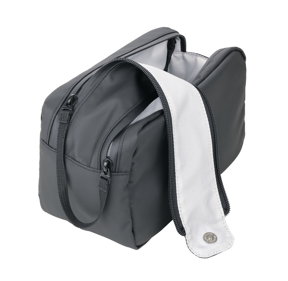 Kulturbeutel, Hauptfach mit weiter Öffnung zur einfachen Entnahme, zwei Reißverschlüsse und zusätzlicher Magnet zum Verschließen, zwei Meshfächer und drei Elastikbänder im Hauptfach, zusätzliche Fronttasche, mit Handschlaufe, wasserabweisende Reißverschlüsse, spritzwassergeschützt (Wasserdichtheitsgrad IPX4), Tarpaulin: 80% Polyester, 20% Polyurethan (PU), Tarpaulin (Plane), schwarz