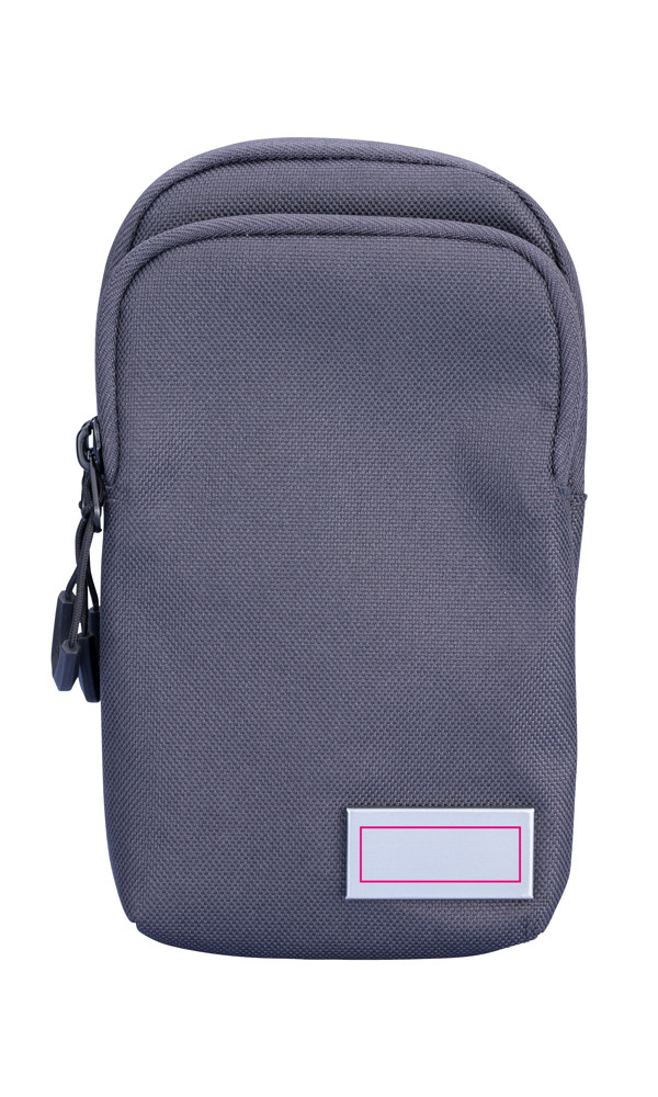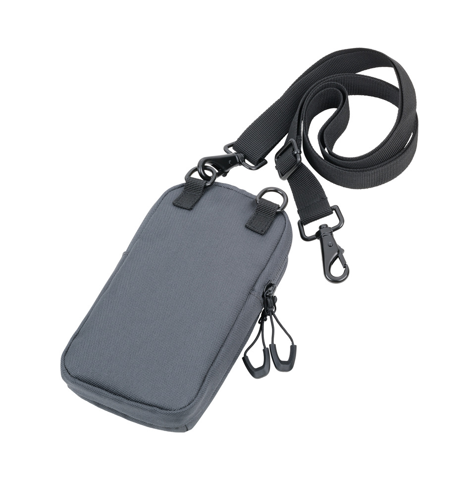 Smartphone Umhängetasche aus recyceltem Meeresplastik, großes Fach für das Smartphone, weiteres Fach für andere Utensilien (Visitenkarten, Schlüssel, Bargeld, Kopfhörer, etc.), verstellbarer Gurt mit Metallkarabinern, 100% rPET, recyceltes Meeresplastik, dunkelgrau