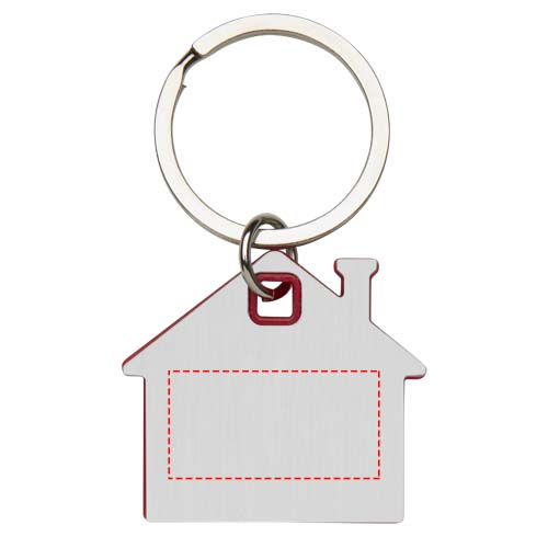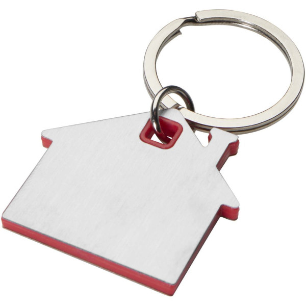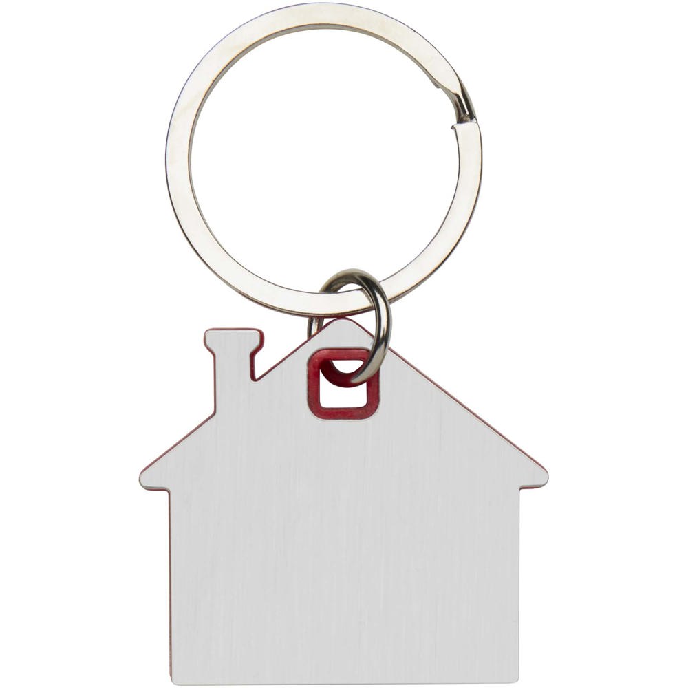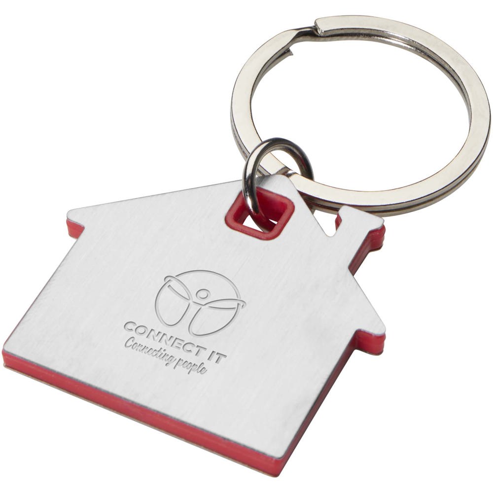 Schlüsselanhänger in Form eines Hauses mit einer Edelstahlplatte mit mattem Design auf der Vorder- und Rückseite und einem farbigen Kunststoffchip in der Mitte.