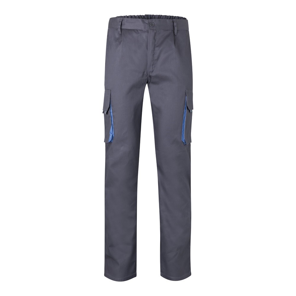 Zweifarbige Twill-Hose mit mehreren Taschen (200 g/m²), aus Baumwolle (35%) und Polyester (65%). Mit elastischem Bund und kontrastierenden Farben an den Zwickeln, Zugbändern und Nähten. Enthält sechs Taschen: (2 französische Taschen, 2 seitliche Zwickeltaschen und 2 Gesäßzwickeltaschen). Größe: 34, 36, 38, 40, 42, 44, 46, 48, 50, 52, 54, 56, 58, 60