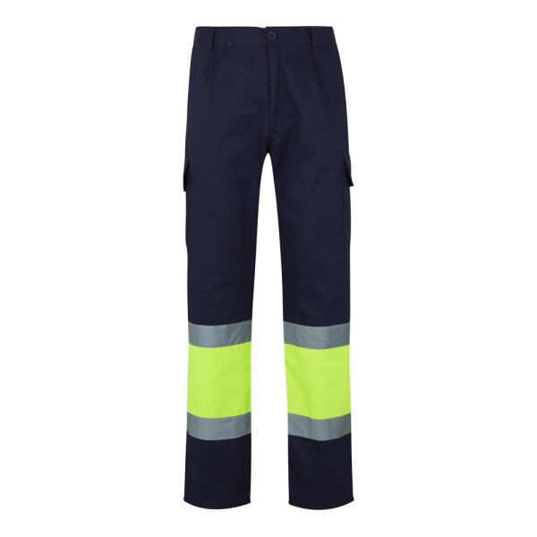 Zweifarbige Twill-Hose mit mehreren Taschen (210 g/m²), aus Baumwolle (20%) und Polyester (80%). Mit elastischem Bund und reflektierenden Streifen an der Unterseite der Hose. Enthält sechs Taschen (2 französische Taschen, 2 seitliche Blasebalgtaschen und 2 hintere Blasebalgtaschen). Produkt gemäß EU-Verordnung 2016/425, zertifiziert nach EN20471 und Klasse Nº 1. Größe: 4XL, 5XL