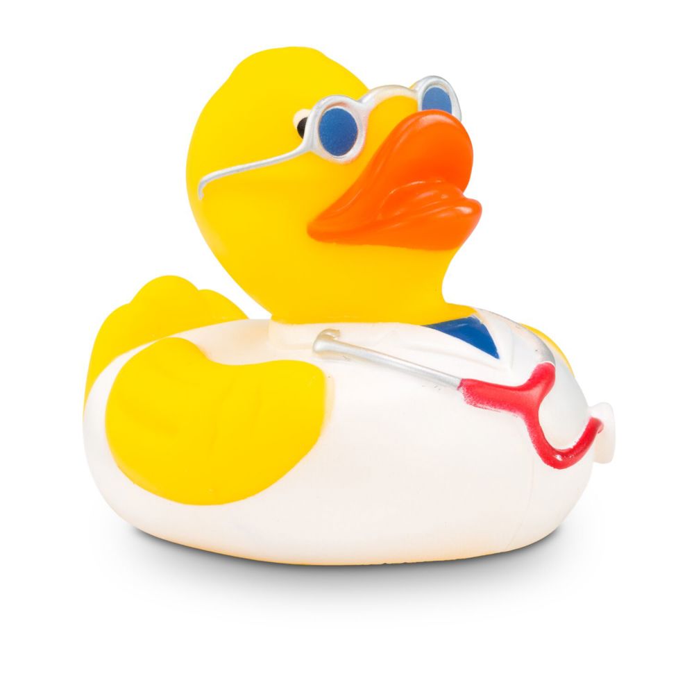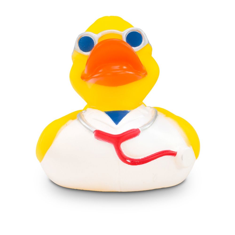 Hier kommt die Ente mit Doktortitel - Max Medicus, der charmante Entenarzt. Er trägt einen weißen Arztkittel und ist mit seinem Stethoskop und der Brille stets bereit für eine freundliche Visite im Krankenhaus oder der Praxis. Größe: ca. 8 cm. Inklusive Quietschventil