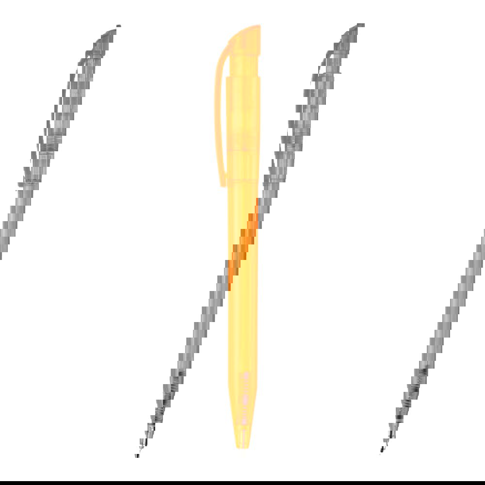 Moderner transparenter Kugelschreiber mit gebogenem Clip. Ein beliebter Werbeartikel wegen seiner großen Druckfläche. Druckkugelschreiber ausgestattet mit einer blau schreibenden X20-Refill-Mine. Druckkugelschreiber aus ABS, hergestellt in Europa. Ab einer Abnahmemenge von 5.000 Stück sind eigene Farbkombinationen möglich.