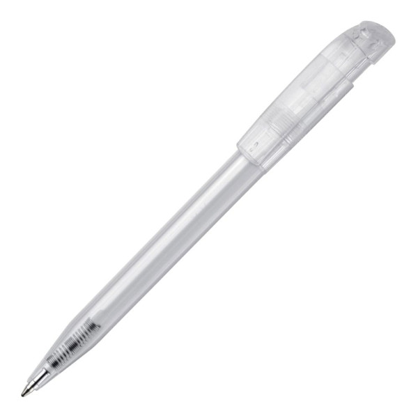 Moderner transparenter Kugelschreiber mit gebogenem Clip. Ein beliebter Werbeartikel wegen seiner großen Druckfläche. Druckkugelschreiber ausgestattet mit einer blau schreibenden X20-Refill-Mine. Druckkugelschreiber aus ABS, hergestellt in Europa. Ab einer Abnahmemenge von 5.000 Stück sind eigene Farbkombinationen möglich.