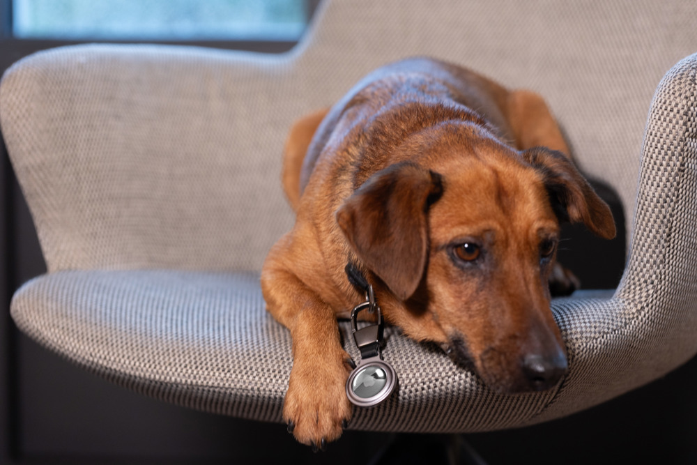 Schlüsselanhänger / Schutzhülle für APPLE AirTag®, mit Karabiner für flexible Befestigung an: Schlüsselbund, Rucksack, Laptoptasche, etc., Aussparung mit Magnetverschluss, Aluminium, matt, silberfarben