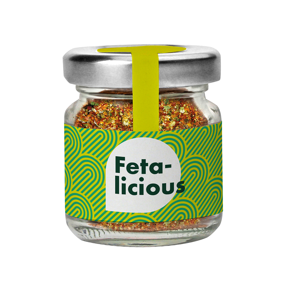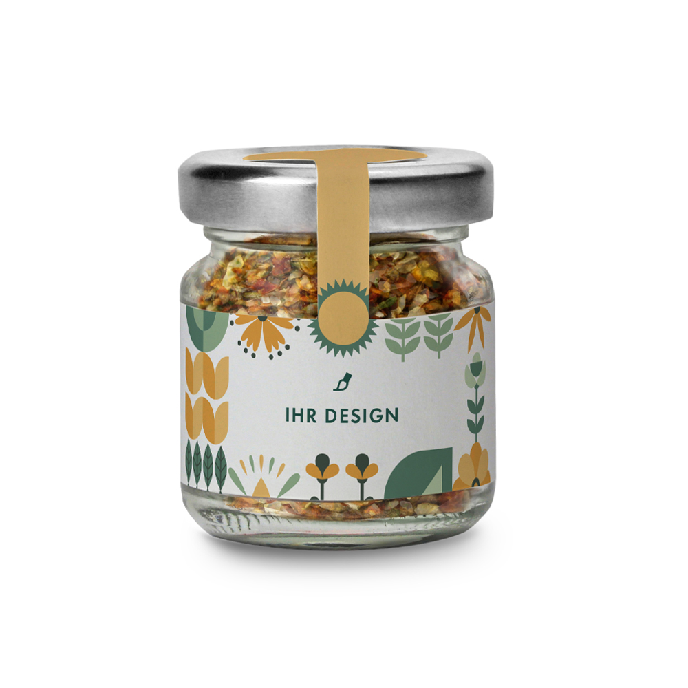 Mini Schraubglas mit feiner Gewürzmischung (10 verschiedene Gewürze) Ihrer Wahl, Mit individueller Etikettierung in Ihrem Corporate Design. Gegen Aufpreis mit passendem ReUse Deckel. Inhalt: ca. 20 g Gewürzmischung.