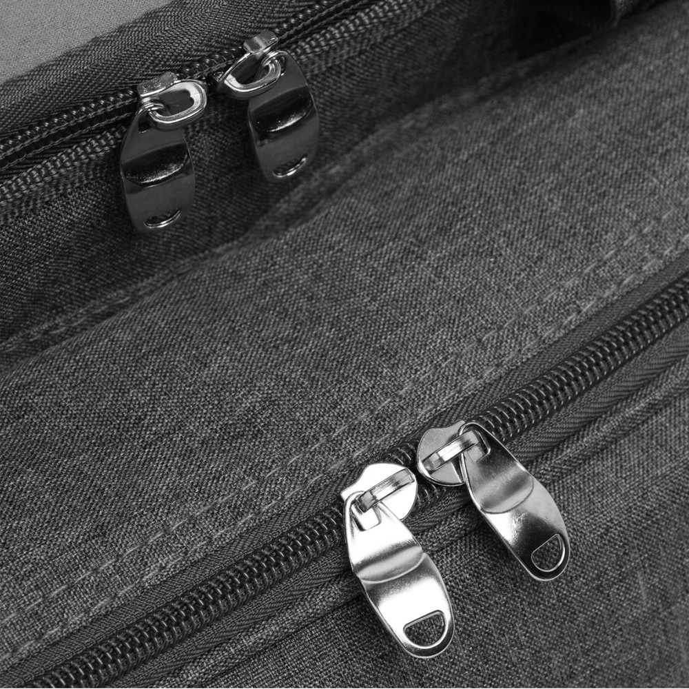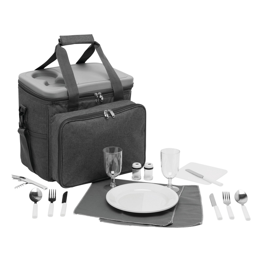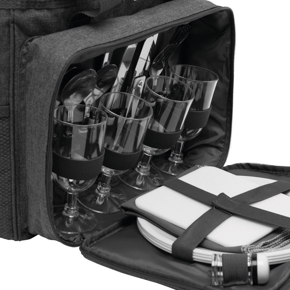Picknick-Tasche SIDE TRIP für 4 Personen: isoliertes Reißverschluss-Hauptfach, mit praktischer Abstellfunktion im Deckel, Reißverschluss-Vorfach inkl. Besteck, Kunststoff-Geschirr und -Weingläsern, Kellnermesser, Stoffservietten, Salz- und Pfefferstreuer sowie Schneidebrett, 2 seitliche Netzeinsteckfächer außen, verstell- und abnehmbarer Schultergurt, 2 Tragegriffe