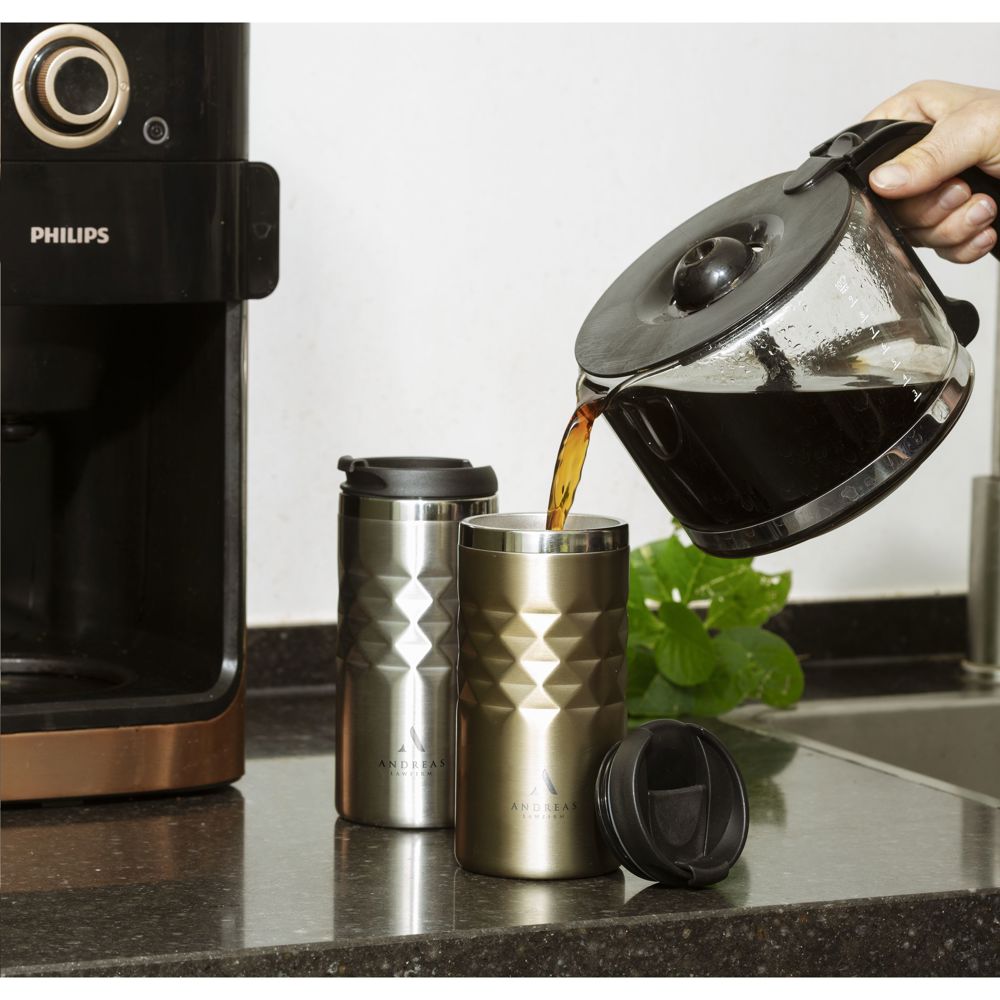 Doppelwandiger Thermobecher aus recyceltem Edelstahl. Mit Schraubdeckel mit Klicköffnung. Mit auffallendem geometrischem 3D-Rautenmuster im Halter. Rutschfeste Unterseite. Nicht spülmaschinengeeignet. RCS-zertifiziert. Recyceltes Material insgesamt: 74%. Fassungsvermögen 280 ml. Edelstahl kann viele Male recycelt werden – die Qualität des Materials bleibt dabei weitgehend erhalten. Durch die Verwendung von recyceltem Edelstahl kommt eine geringere Menge an neuen Rohstoffen zum Einsatz. Das bedeutet weniger Energieverbrauch und weniger Wasserverbrauch. Verpackt pro Stück.