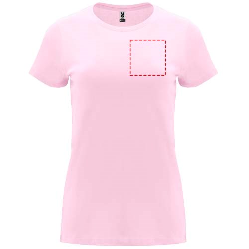 Tailliertes kurzärmeliges T-Shirt für Damen. Rundhalsausschnitt mit 1×1 Rippstrick. Verstärkte und verdeckte Nähte am Kragen. Herausnehmbares Etikett.