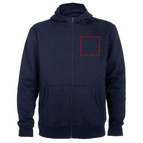 Sweatjacke mit Kapuze, hohem Halsausschnitt und durchgehendem Reißverschluss. Gerippte Details an Kapuze und Taschenpaspeln. Tasche im Känguru-Stil. 2×2 Rippenstrick an Ärmeln und Taille. Herausnehmbares Etikett. Das Modell ist 184 cm groß und trägt Größe L.