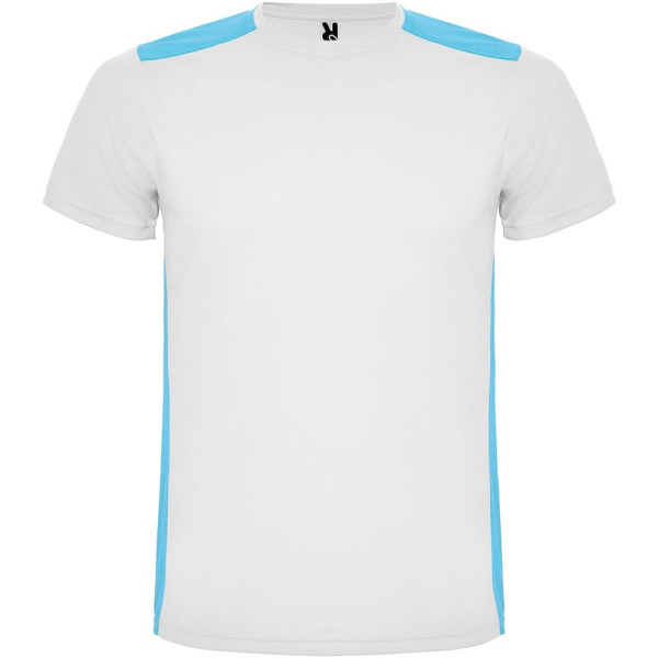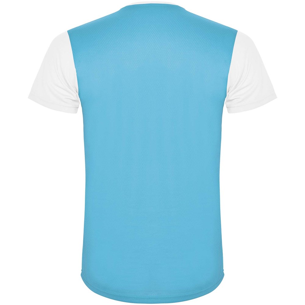 Funktions-T-Shirt aus atmungsaktivem Stoff. Rundhalsausschnitt. Kombination aus zwei Polyestergeweben im Rücken- und Schulterbereich. Polyester Bienenwabe Vorne und 3D-Netz Polyester auf Schulter und Rücken. Material ist feuchtigkeitabsorbierend. Ziernähte auf den Schultern und Seiten. Schnitt mit verlängertem Rückenteil. Abnehmbares Etikett.