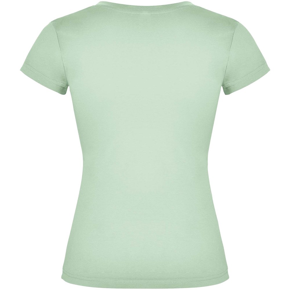 Kurzärmeliges T-Shirt für Damen mit V-Ausschnitt und 1×1-Rippstrickbündchen. Schmale Passform mit Seitennaht. Herausnehmbares Etikett. Das Modell ist 174 cm groß und trägt Größe S.