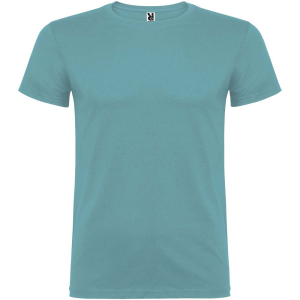 Kurzärmeliges T-Shirt mit doppellagigem Rundhalsausschnitt aus Elasthan, hergestellt aus schlauchförmigem Material für Erwachsene. Verstärkte und verdeckte Nähte am Kragen. Herausnehmbares Etikett. Das Modell ist 190 cm groß und trägt Größe L.