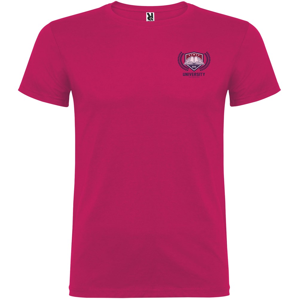 Kurzärmeliges T-Shirt mit doppellagigem Rundhalsausschnitt aus Elasthan, hergestellt aus schlauchförmigem Material für Erwachsene. Verstärkte und verdeckte Nähte am Kragen. Herausnehmbares Etikett. Das Modell ist 190 cm groß und trägt Größe L.