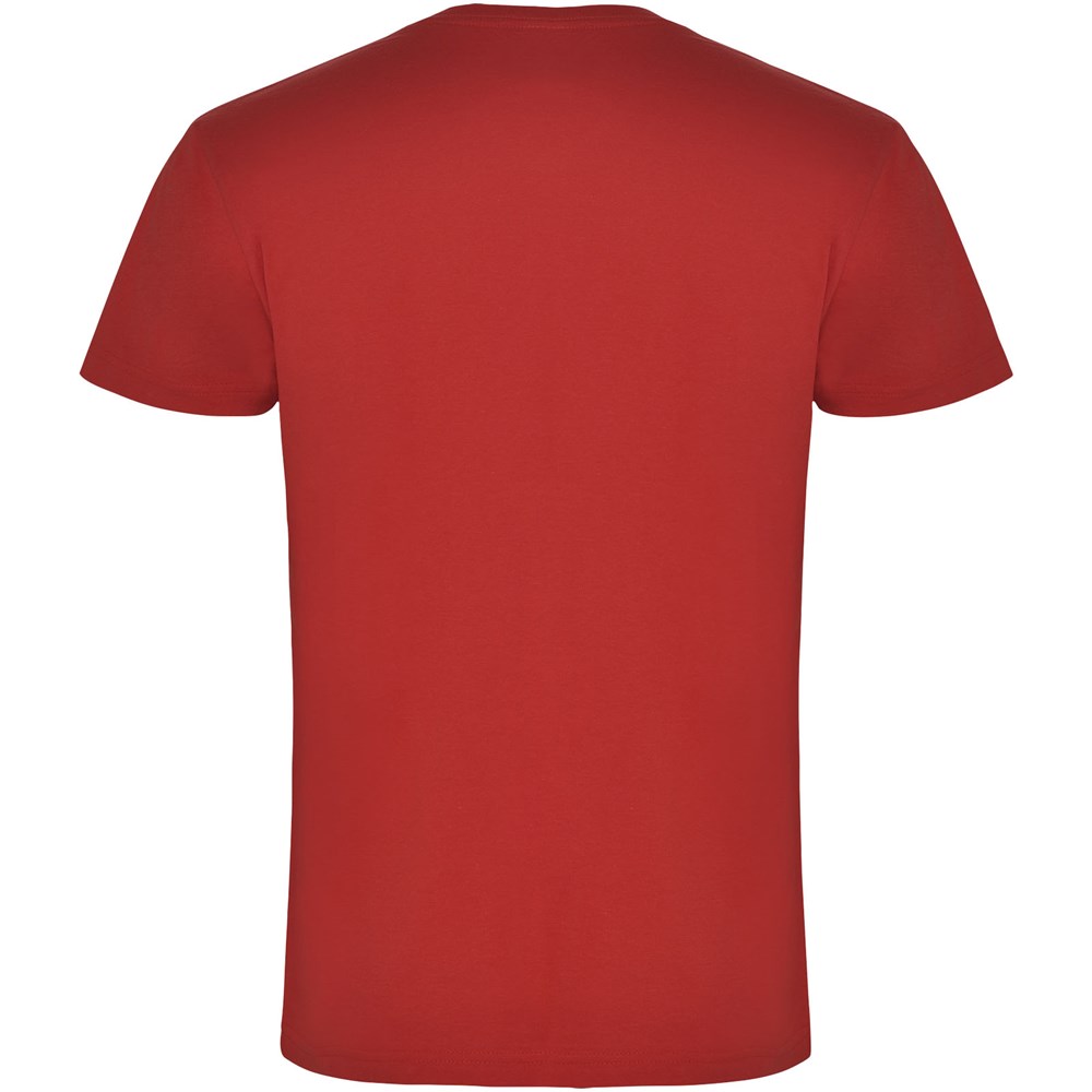 Schlauchförmiges kurzärmeliges T-Shirt mit 2-lagigem V-Ausschnitt. Verstärkte und verdeckte Nähte an Kragen und Schultern. Herausnehmbares Etikett. Das Modell ist 190 cm groß und trägt Größe L.