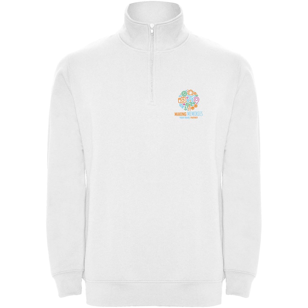 Sweatshirt mit passendem halben Reißverschluss und Polokragen. Passender Innenkragen. Verstärkte, abgedeckte Nähte am Innenkragen. 1×1 Rippbündchen an Ärmeln und Taille. Das Modell ist 185 cm groß und trägt Größe M.