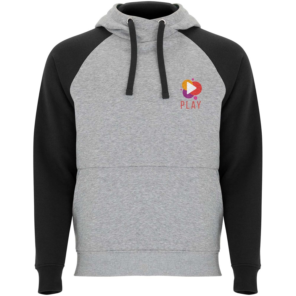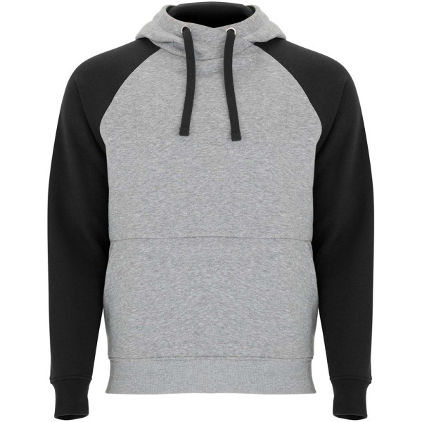 Zweifarbiger Unisex Kapuzenpulli. Kapuze mit gekreuztem Kragen und Metallösen. Innenkapuze, Kordelzug und Raglanärmel in Kontrastfarbe. Kängurutasche. Bündchen und Saum aus elastischem 1×1-Rippstrick. Abnehmbares Etikett.