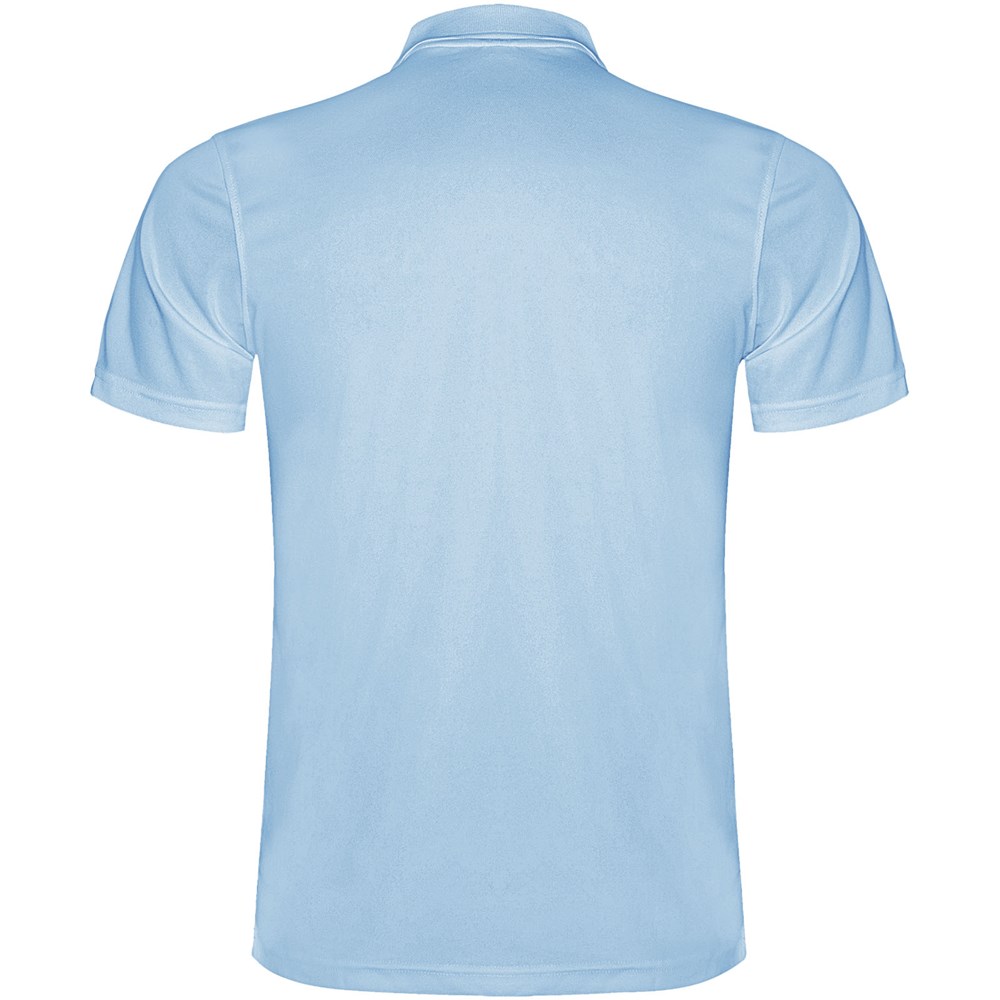 Kurzärmeliges Funktions-Poloshirt. Gestrickter Kragen mit 3-Knopfleiste. Atmungsaktives, leicht zu waschendes und zu trocknendes Material. Herausnehmbares Etikett. Technisches Gewebe. Atmungsaktiver Stoff. Das Modell ist 184 cm groß und trägt Größe L.