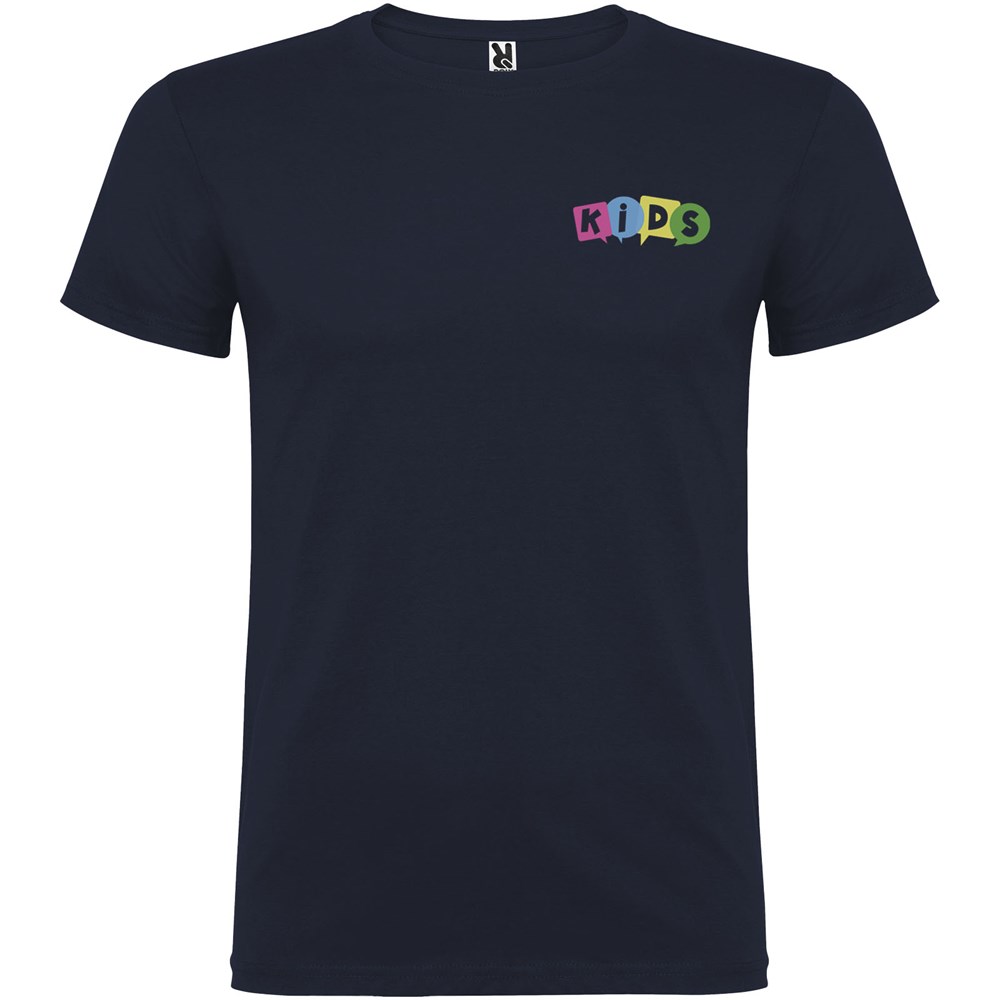 Kurzärmeliges T-Shirt mit doppellagigem Rundhalsausschnitt aus Elasthan, hergestellt aus mit Seitennähten. Verstärkte und verdeckte Nähte am Kragen. Herausnehmbares Etikett. Das Modell ist 120 cm groß und trägt Größe 5/6.
