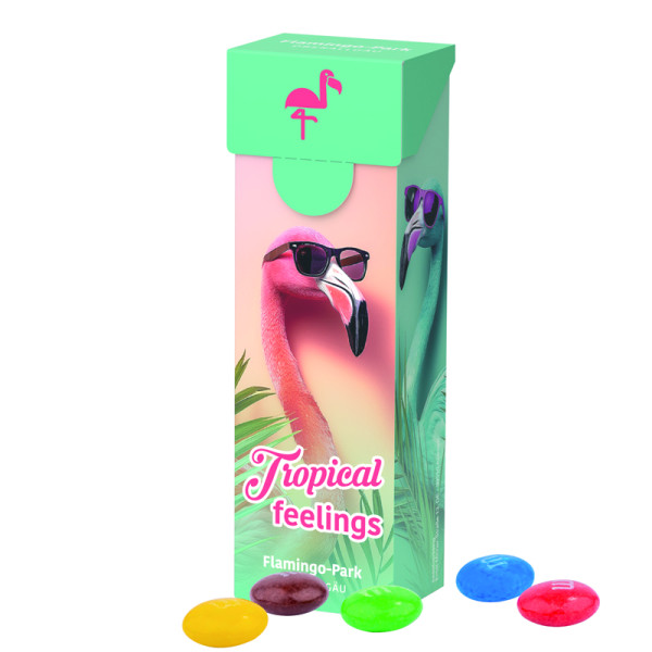 Box mit "Klick-Verschluss", aus weißem Karton, Box individuell bedruckt, mit Originalaitätsverschluss. Inhalt: M&M's Chocolate, 35 g
