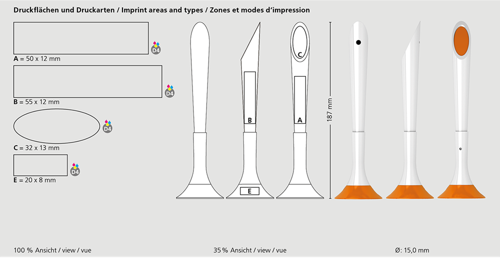 Der Deskpen matt ist ein Stehkugelschreiber. Materialien und Oberflächen: Sockel, Halterung, Schaft und Stopfen: Kunststoff (ABS) matt. Standardfarben: Sockel, Halterung, Schaft und Stopfen: aus 9 Farben kombinierbar. Sonderfarben: ab 5.000 Stück, ab 25.000 Stück ohne PMS-Zuschlag. Standardmine: Silktech XL (5.000 m), blau oder schwarz, Mine optional: Multifill P.