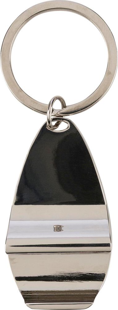 Schlüsselanhänger aus Zinklegierung verfügt über einen Metallring und eine Bambus-Einlage auf der Vorderseite. Er verfügt über eine Flaschenöffnerfunktion. Er wird in einer Papiertüte geliefert.