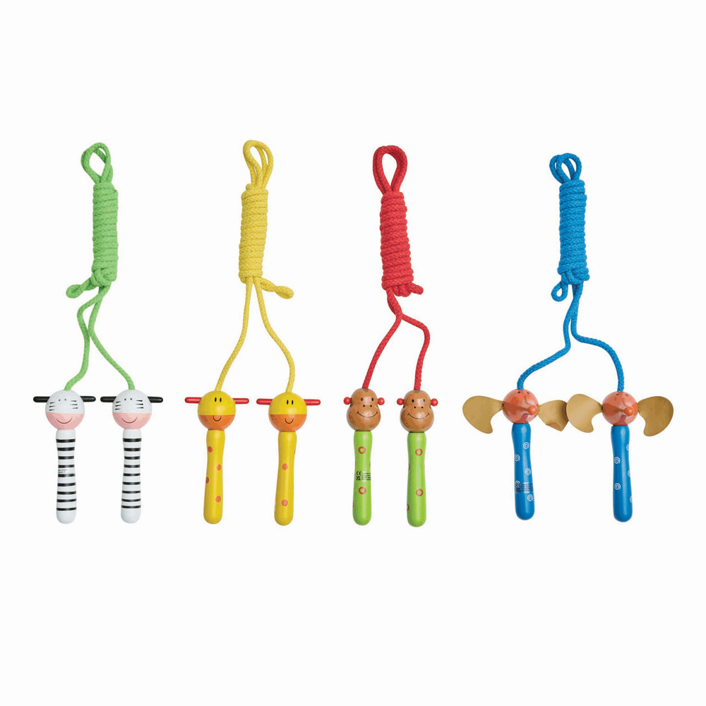 Bunte Springseile ANIMAL ANIMATION: mit verschiedenen Tiermotiven (Elefant, Affe, Zebra, Giraffe) am Holzgriff, 4-fach sortiert