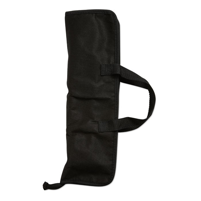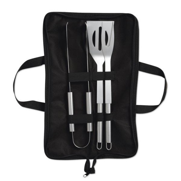 3-teiliges Edelstahl-BBQ-Set inkl. Grillgabel, Grillzange und Wender. Verpackt in einer schwarzen Non Woven Tasche mit Reißverschluss.