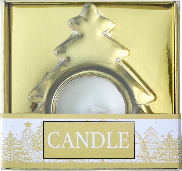 Teelichthalter 'X-MAS Tree' aus Glas im Tannenbaum-Design, inklusive Teelicht, verpackt in einer farbigen Geschenkbox mit Klarsichtdeckel und Schleife.