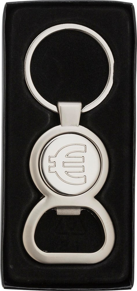 Schlüsselanhänger aus Metall, mit Flaschenöffner, Einkaufswagenchip (mit Magnet) und Metall-Schlüsselring, in schwarzer Geschenkbox.