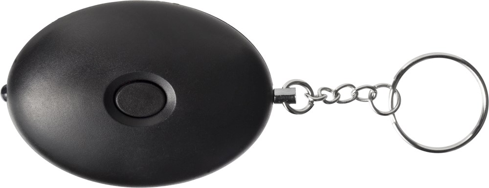 Alarmknopf aus ABS Kunststoff mit Schlüsselkette und -ring. Das LED Licht wird durch Drücken des Knopfs ausgelöst. Durch das Ziehen am Stift wird der Signalton ausgelöst.