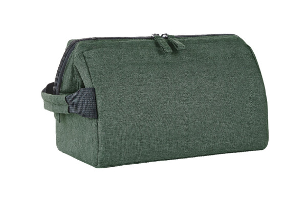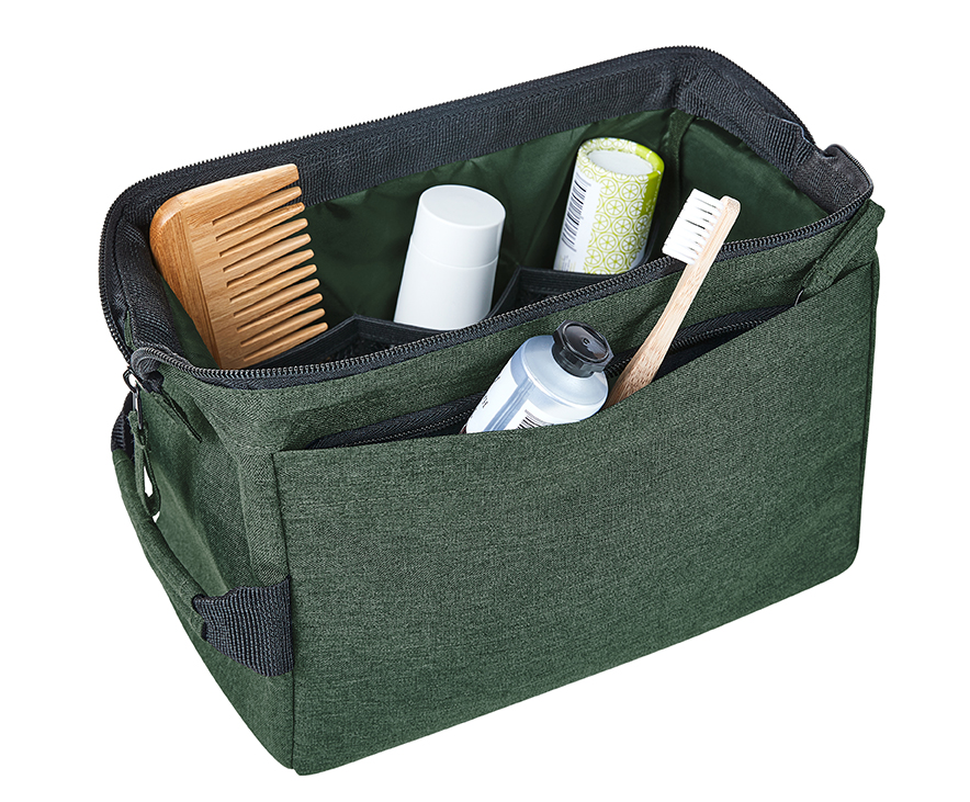 formschöne Reißverschlusstasche mit stabiler Metallbügelöffnung zum Aufstellen oder -hängen; rPET-Obermaterial; großes, gepolstertes Hauptfach mit diversen Organizer-Elementen; Reißverschlussvortasche; Handgriff