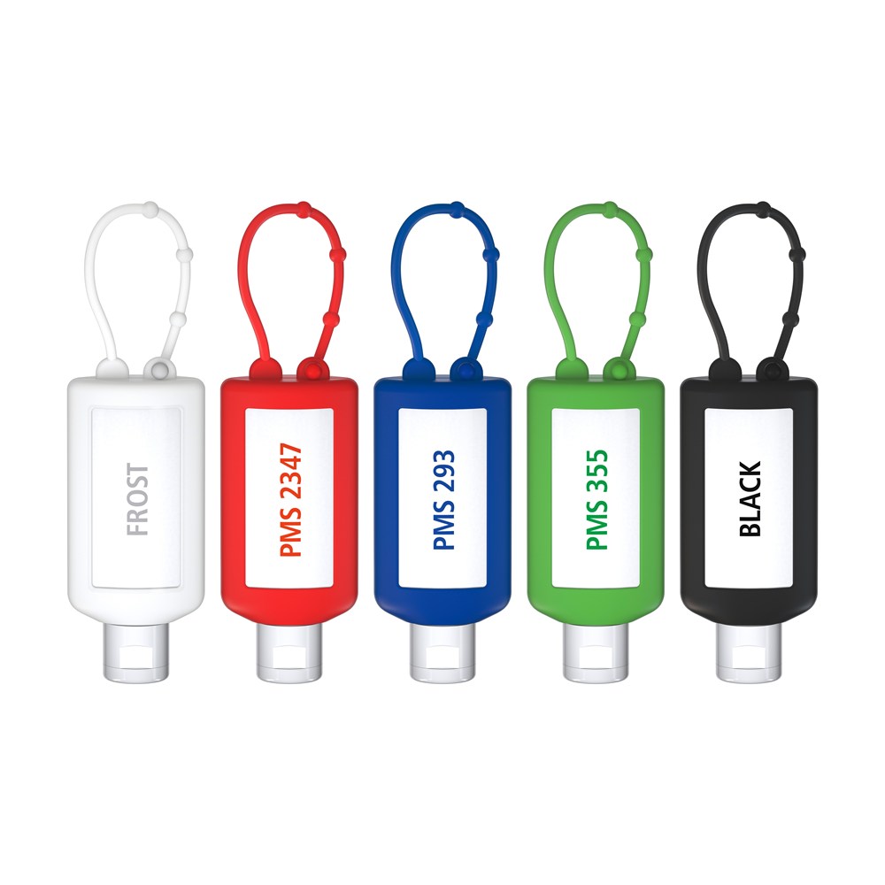 50 ml Flasche und Klappdeckel (zufällig ausgerichtet) weiß; Silikonhülle und Schlaufe in rot. Nachfüllbar. Flasche hergestellt aus 100% recyceltem PET, weiß mit leichter R-PET-Färbung.